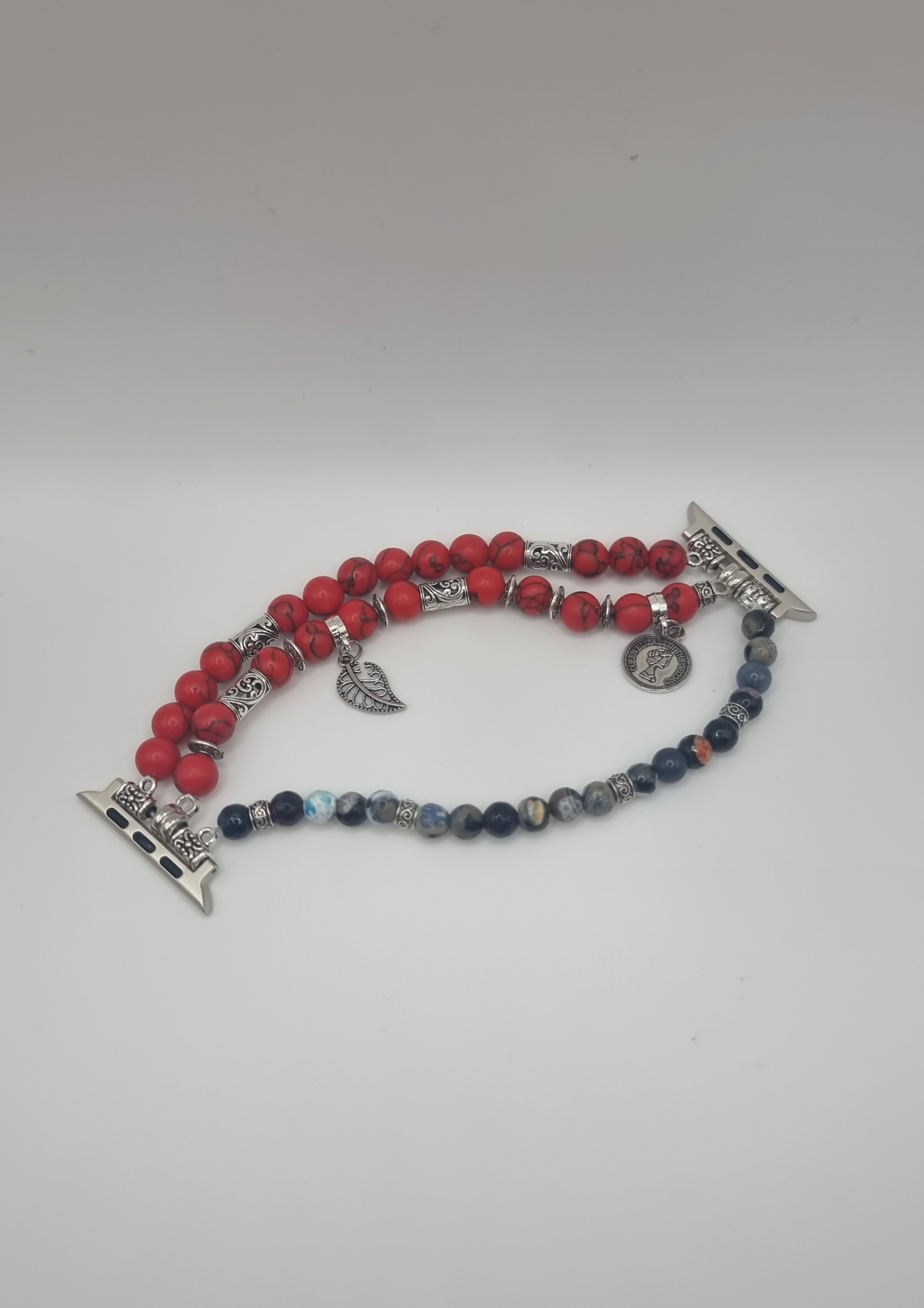 Make a bold statement with this handcrafted double-layer beaded strap by Ceelo, designed exclusively for Apple Watch models. Featuring rich red jasper-style beads with natural marbling, paired with deep navy and black accent stones, this piece delivers a powerful yet refined look.