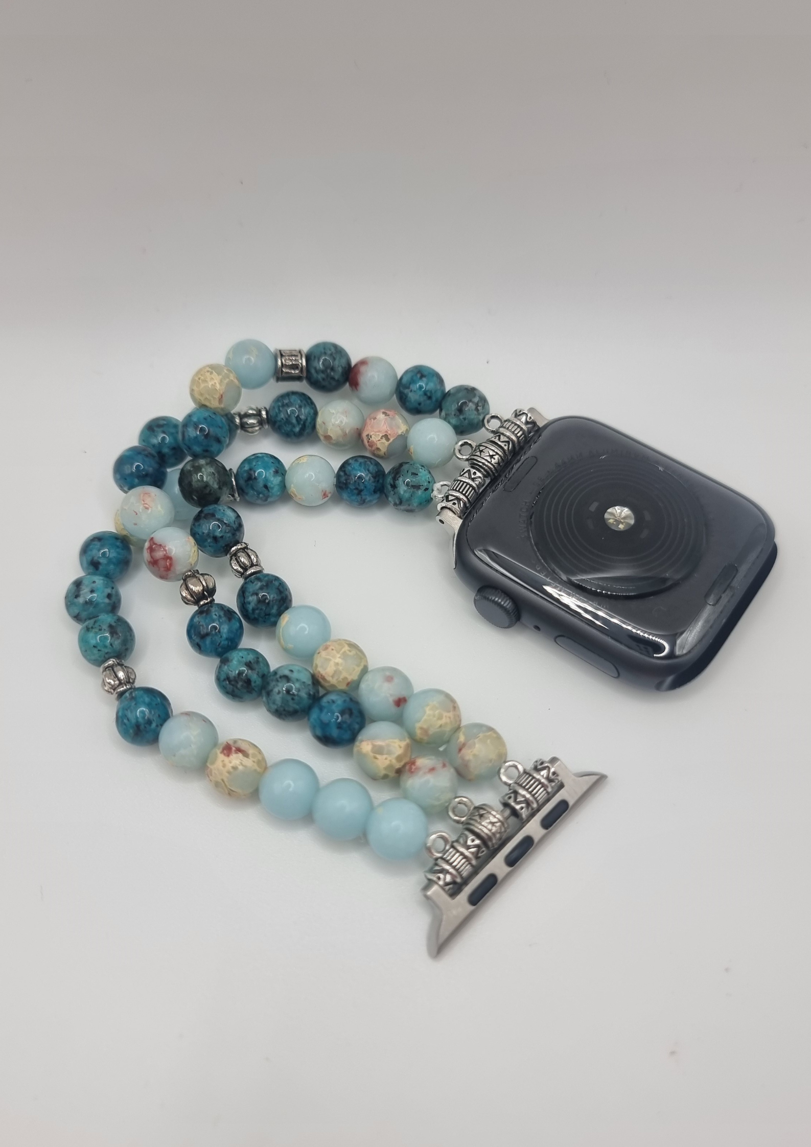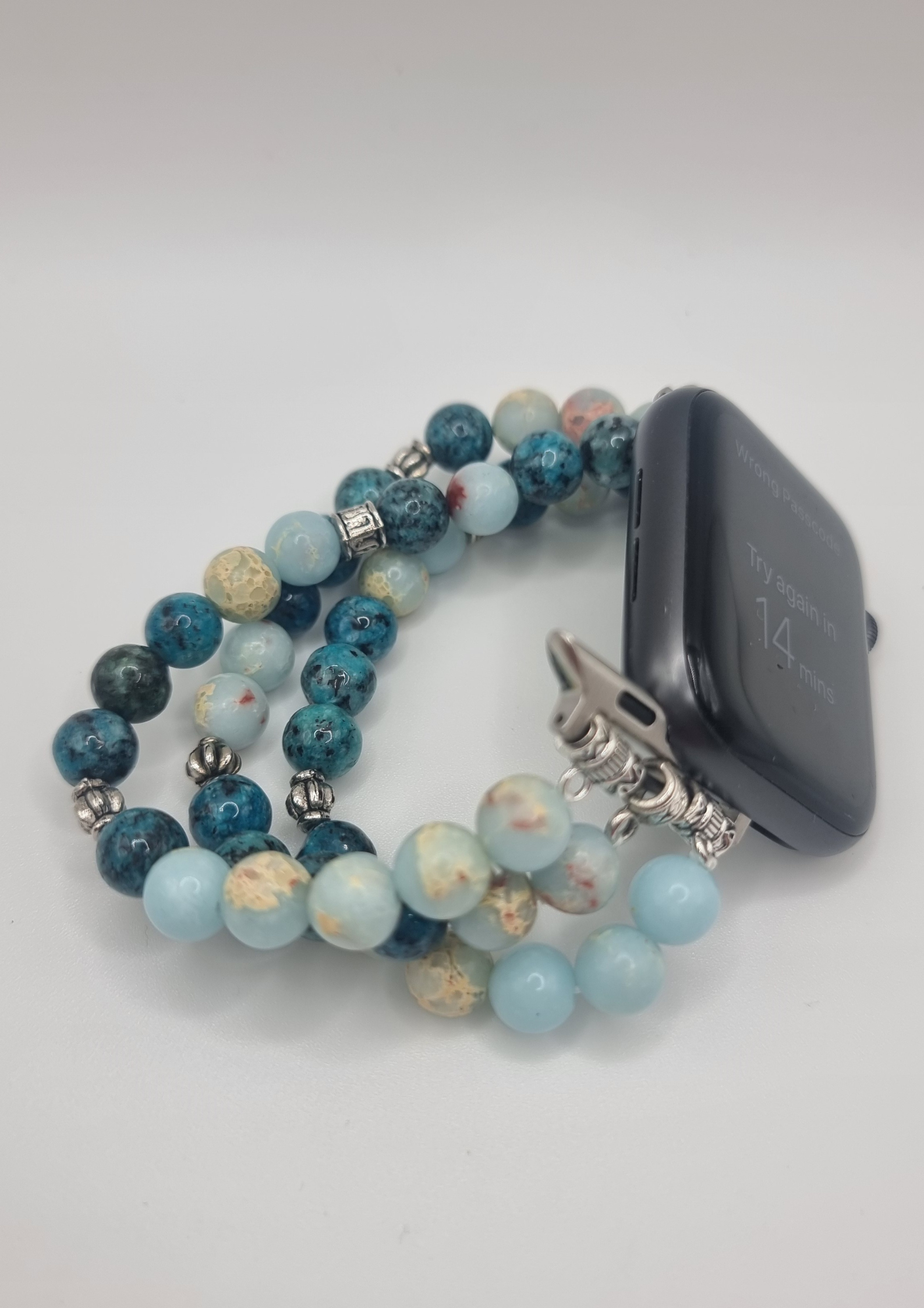 Refresh your Apple Watch style with this handcrafted double-layer beaded strap by Ceelo, designed exclusively for Apple Watch models. This elegant piece features a beautiful mix of turquoise, aqua blue, and soft natural stone beads, creating a calming ocean-inspired palette.
