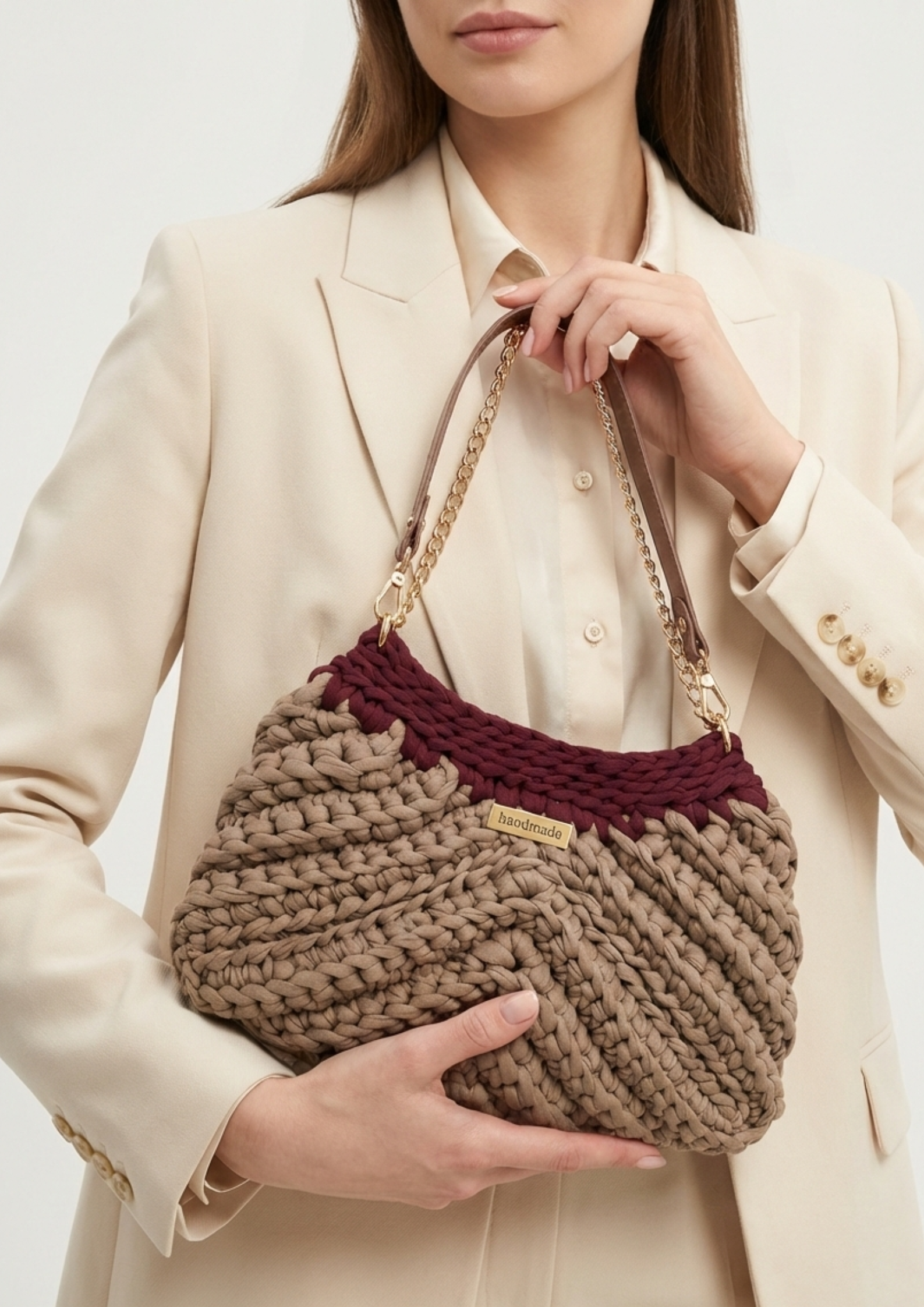 Add a touch of handcrafted elegance to your look with this handmade crochet crossbody clutch. Designed with a beautifully textured crochet body in warm neutral tones and a contrasting top panel, it features gold-tone hardware and a stylish chain strap for versatile wear. The detachable faux leather wrist strap adds extra convenience, allowing you to carry it as a clutch or crossbody bag. Perfect for casual outings or evening looks, this unique handmade piece combines comfort, functionality, and artisanal charm.