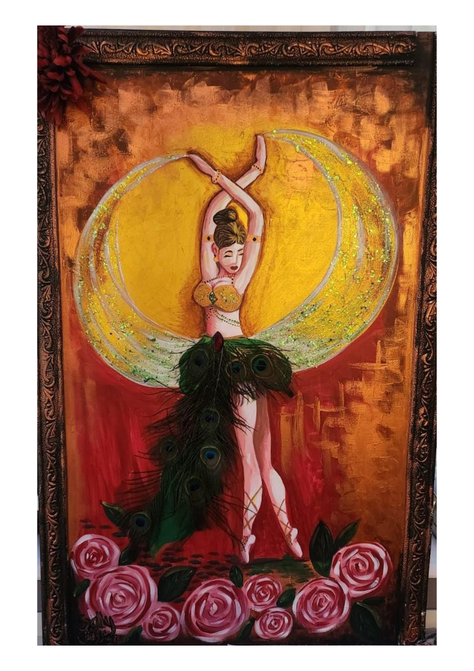 Finished with shimmery acrylic and 3D outlines, this artwork radiates movement and empowerment — a celebration of confidence and feminine energy.